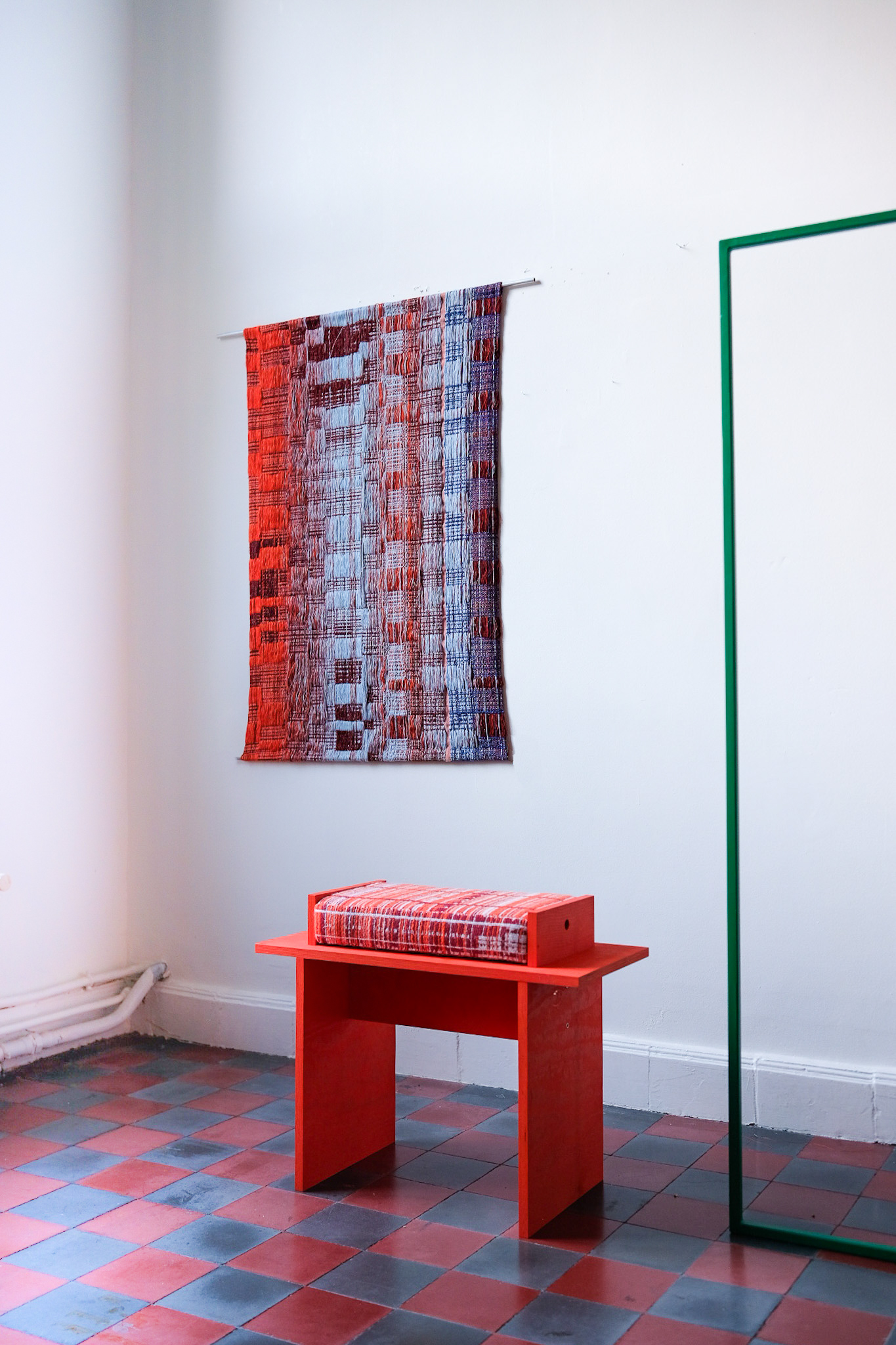 A new object crafted from hand-stained plywood and jacquard-woven textiles, this design blends vibrant colors with refined craftsmanship.